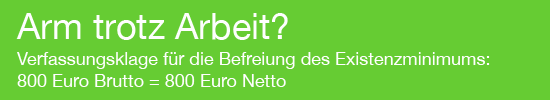 Sehr geehrte Damen und Herren, liebe Mitbürger man könnte sagen, es ist schon fast vollbracht: Nach Jahren des Sinnierens hat das Bundesverfassungsgericht festgestellt: Die Hartz-IV-Regelsätze sind verfassungswidrig. Wir werden dem Gericht eine zweite entscheidende Frage stellen: Ist es grundgesetzkonform, dass Mitbürger nur deshalb zu Hartz-IV-Empfängern werden, weil der Staat ihnen von ihrem Lohn mehr abnimmt, als sie selbst zum Leben (auf niedrigstem Niveau) benötigen? Für uns, und wir glauben, für alle ehrlich und klar denkenden Mitbürger, kann die Antwort nur sein, dass dieser Zustand, wie er heute im Sozialversicherungsrecht noch herrscht, eindeutig gegen das Grundgesetz verstößt. Kein Bürger darf allein DURCH die staatlichen Abgaben unter die Existenzgrenze gedrückt werden! Das Verfahren für die von uns angestrebte Verfassungsklage ist jetzt nach fast anderthalbjähriger Vorbereitung endlich eingeleitet, damit die politisch zu verantwortende Verarmung von Familien und Niedrigverdienern durch das Sozialversicherungsrecht bald endet: Das (Familien)-Existenzminimum ist im Steuerrecht von allen Abgaben befreit - im Sozialversicherungsbeitragsrecht werden hingegen 41%-SV-Beiträge vom Lohn bei den Arbeitnehmern abgezogen, auch vom Existenzminimum. So wird bei den "abhängig" Beschäftigten aus guten Bruttolöhnen oft genug ein Netto-Armutslohn. 30.000 Euro Gesamtlohn bedeuten 20.000 Euro nach SV-Abgaben - egal wie groß die Familie ist.